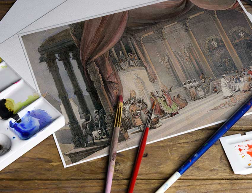 This watercolour, executed between 1830 and 1840, was titled ‘Europeans Being Entertained by Dancers and Musicians in a Splendid Indian House in Calcutta During Durga Puja.’ The painting is regarded as one of Prinsep’s finest watercolour works, highlighting his greater fascination with the cultural characteristic of the festival rather than its religious aspect, which contrasts with the interest of most other painters.
